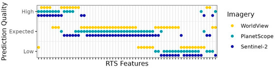 Prediction quality across all imagery types for each RTS feature in the testing dataset. RTS features tended to have the same or similar prediction qualities across imagery types, indicating that there were characteristics of RTS features that made them more or less detectable across imagery types.