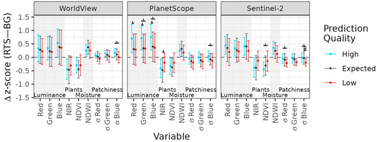 The difference in input data values between RTS and non-water background (BG) pixels (RTS—BG) across prediction quality classes. The points were calculated by first taking the difference in mean pixel values (z-score) between RTS and non-water background (BG) pixels on a tile-by-tile basis and then averaging this value across all 63 testing tiles. The error bars show the standard deviation across tiles. Z-scores were calculated using all pixel values, including water pixels. Relative elevation and shaded relief are not included, as there were no discernable patterns across classes. Statistically different groups are indicated with lines between the two classes and a label for the level of significance (p < 0.1: ‘.’, p < 0.05: ‘*’).