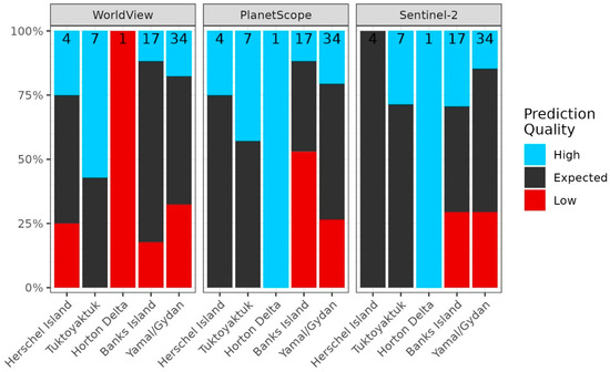 Prediction quality across geographic regions. The percentage of predictions that were high, expected, and low is shown on the Y-axis. The total count of RTS features within each region is indicated at the top of the bars. Banks Island and the Yamal/Gydan region had the highest percentage of low-quality predictions.