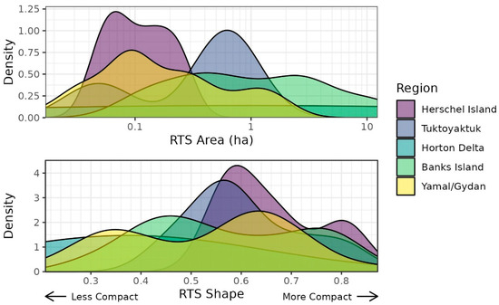 Frequency distributions of RTS Area and RTS shape across regions. Region is indicated with the fill color. RTS Area is shown on a log scale. Smaller RTS shape values indicate less compact shapes, and larger values indicate more compact or circular shapes.
