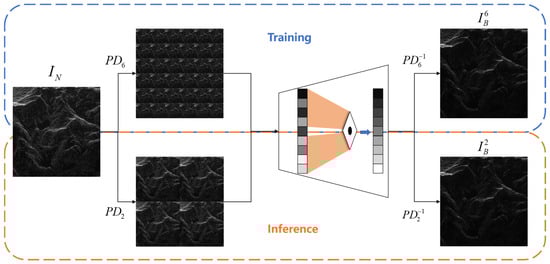 Pixel-shuffle downsampling [24] is a technique that is primarily used in image processing that rearranges pixels in a specific way to reduce the spatial correlation between adjacent pixels in an image. It involves subsampling the image with a stride factor s, transforming the image into multiple sub-images with reduced spatial correlation between pixels. Since the use of BSN requires the noise in the image to be pixel-wise independent, using these PD-processed sub-images as inputs for BSN meets this requirement. However, a stride factor s that is too small cannot sufficiently reduce the spatial correlation between pixels, and too large a stride factor can result in aliasing artifacts. To address the limitations of applying PD with BSN, the asymmetric pixel-shuffle [19] introduces different stride factors for training and inference. This asymmetry helps balance the trade-off between breaking pixel spatial correlations and preserving image details. Figure 2 shows the simplified structure of the asymmetric pixel-shuffling blind spot network.