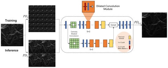 In this network, the upper path employs a 2× dilation rate, which expands the field of view and allows the network to recognize large patterns and textures. This is effective for detecting broad noise trends and large-scale image features. The lower path utilizes a 3× expansion rate, effectively improving the capture of global information. To further extend the network’s perceptual capabilities, we add non-local modules to the two-layer paths to capture contextual information more comprehensively. Through asymmetric pixel-shuffle downsampling, we use different step factors during the training and inference processes to further improve the ability of the network to extract the prior information from the image.