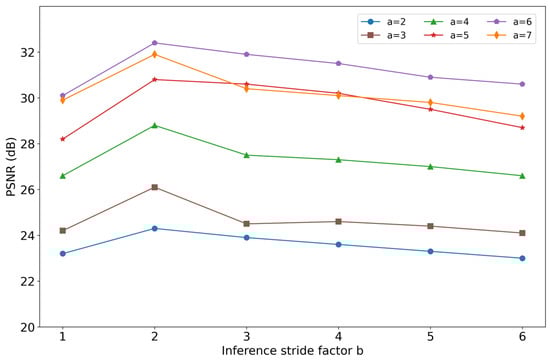 In order to balance the aliasing noise in the training and inference phases and maximize the training effect, we need to choose the appropriate stride factors for each phase. By experimenting with different pacing factors, we can observe how they affect the model’s performance and identify the most suitable configuration for a particular dataset. Through this systematic tuning and comparison, we are able to ensure that the chosen stride factors really help to improve the model performance. The results presented in Figure 4 demonstrate that the SNR is highest when the spanning factors are set to a = 2 and b = 6. This finding suggests that the model achieves optimal performance at these parameter settings.
