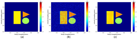 In our simulation, we assessed the effectiveness of the proposed method in extracting distributed targets with distinct edge features, utilizing rectangles, triangles, and circles as test objects. Figure 7 presents the outcomes of applying our method to these various shapes. Specifically, Figure 7a displays the original reference images, Figure 7b shows images with substantial noise, and Figure 7c depicts the results after applying our proposed method. The findings demonstrate that the method effectively suppresses noise while preserving the clarity of edges across all three distinct target types. This outcome confirms the efficacy of the proposed method in accurately extracting prior information, underscoring its potential utility for applications requiring precise edge detection in noisy environments.