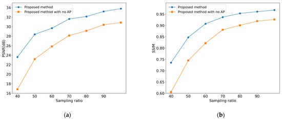 We further investigated the impact of asymmetric pixel-shuffling downsampling operation on model performance through ablation studies that examined their effects on image reconstruction capabilities. Holding other parameters constant, we assessed the image reconstruction performance both before and after implementing the asymmetric pixel-shuffling operation. We employed PSNR and SSIM as evaluation metrics to determine the influence of this operation across various sampling ratios.