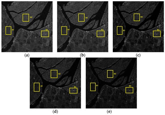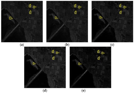 Imaging results of the ferry terminal area using different methods. (a) CSA; (b) L1 + TV; (c) PPB; (d) SAE-Net; (e) proposed method.