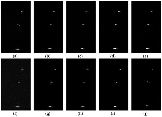 Imaging results of ships comparison across different methods and sampling ratios. The first row (a–e): Full Sampling Results (CSA, L1+TV, PPB, SAE-Net, Proposed method); the second row (f–j) 80% Sampling Results (CSA, L1+TV, PPB, SAE-Net, Proposed method).