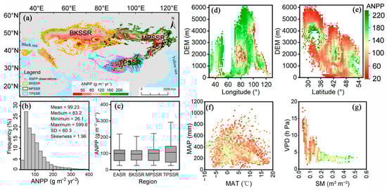 Ensemble mean of ANPP in Eurasian grasslands during 1982–2020. (a) Spatial distribution of the ANPP, (b) frequency distribution of the ANPP, (c) mean ANPP in the entire region and three subregions (BKSSR, MPSSR, and TPSSR), (d) variations in ANPP along elevation and longitude gradients, (e) variations in ANPP along elevation and latitude gradients, (f) variations in ANPP along MAP and MAT gradients, and (g) variations in ANPP along SM and VPD gradients.