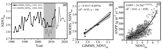 The growing season integrated NDVI is a more direct measure of the interannual variability of vegetation activity, and therefore, commonly estimates primary production [44]. We used 39-year (1982–2020) NDVIint data from the satellite-based MODIS and GIMMS sensor. We analyzed and found that MODIS NDVIint is generally low overall compared with GIMMS NDVIint range from 2004 to 2013 (Figure 2a). To eliminate the overall bias and obtain long-term NDVIint data from 1982 to 2020, we combined coincident periods of MODIS NDVIint and GIMMS NDVIint and constructed a linear relationship (R2 = 0.93) during 2004–2013 (Figure 2b). Then, we recalibrated the MODIS NDVIint based on GIMMS NDVIint and produced long-term NDVIint from 1982 to 2020 in Eurasian grasslands.