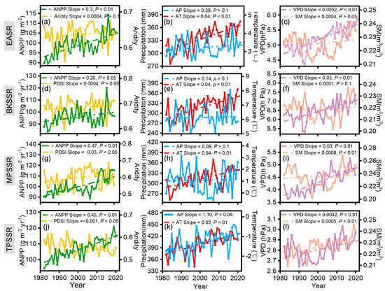 Interannual dynamic of ANPP (a,d,g,j), Aridity (b,e,h,k), and VPD (c,f,i,l) in EASR (a–c), BKSSR (d–f), MPSSR (g–i), and TPSSR (j–l), respectively. The solid curves represent regression function.