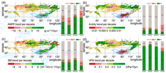 Spatial distribution of trend in ANPP (a), Aridity (b), SM (c), and VPD (d) in EASR from 1982 to 2020. The green, red, and gray colors represent positive, negative, and nonsignificant trends, respectively. Significance was set at p < 0.05.