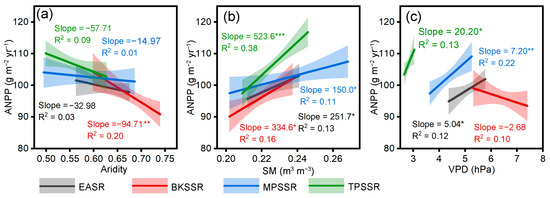 The temporal variations of ANPP with Aridity (a), SM (b), and VPD (c). The shadings represent the 95% confidence of regression analysis. The R2 represents the degree of explanation of the variable, and *, **, *** represent significance at p = 0.05, p = 0.01, and p = 0.001 levels, respectively.