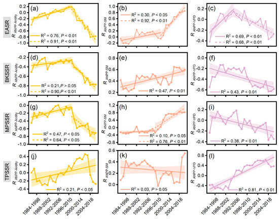 In the three subregions, the correlation between ANPP and drought metrics was not consistent with change patterns in the whole Eurasian grassland. In BKSSR, the correlation between ANPP and Aridity showed a similar pattern with the whole region (Figure 6d), while the positive and negative correlation of SM and VPD showed a linear increase and decrease trend, respectively (Figure 6e,f). In MPSSR, the effects of Aridity and SM on grassland productivity had a similar pattern over the whole region of the Eurasian grassland (Figure 6g,h), while the negative effect of VPD showed a linear decreasing pattern (Figure 6i). Compared with other subregions, the pattern in the correlation of ANPP with Aridity, SM, and VPD was very different and more complex in TPSSR (Figure 6j–l). Specifically, the effect of VPD on grassland growth was favorable in most moving windows and the correlation continued to increase in TPSSR, indicating a tendency toward more intense positive effects of VPD on alpine grassland growth (Figure 6l). In addition, the negative effect of Aridity on ANPP has continued to weaken (Figure 6j), while the positive effect of SM has shown no significant trend in the past four decades (Figure 6k).