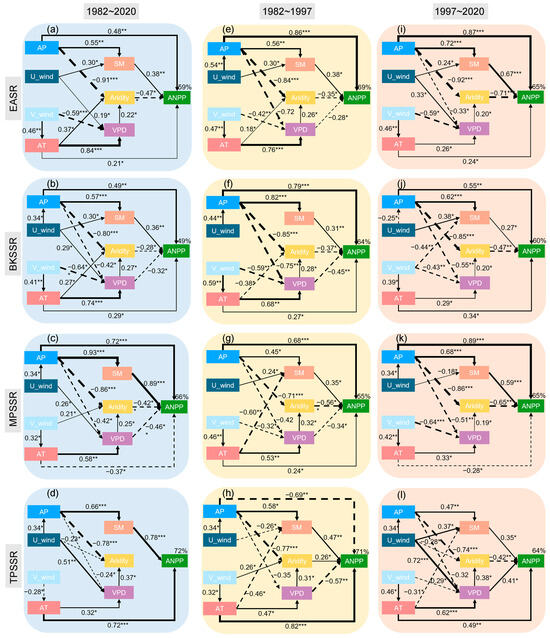 Structural equation models of climate factors (AP, AT, U_wind, V_wind) and water cycle (SM, Aridity, VPD) on spatial variation of aboveground net primary production (ANPP) for EASR (a,e,i), BKSSR (b,f,g), MPSSR (c,j,k), and TPSSR (d,h,l). Solid and dashed arrows represented the positive or negative effects in fitted structural equation models, respectively. The widths of the arrows indicated the strength of the relationships. The percentage (R2) indicated the degrees of explanation of variables, and *, **, and *** represented a significant relationship at p = 0.05, p = 0.01, and p = 0.001 levels, respectively.