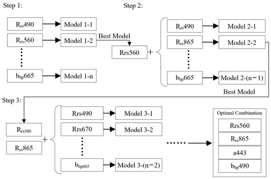 After processing by the QAA algorithm, the Sentinel-2 dataset encompasses 12 features. Some significant autocorrelations may exist among the QAA-derived IOP parameters. Moreover, an excessive number of feature dimensions can lead to an overcomplicated model and reduction in the accuracy of predicted results [43]. As a result, this study utilizes the wrapper method [53] for feature selection to preserve as much of the nonlinear enhancement relationship among IOPs and Rrs at different wavelengths, instead of directly reducing available dimensions using methods like the principal component analysis (PCA). The wrapper method is an iterative feature selection process, which uses the machine learning algorithm to select the optimal subset of features. By choosing the best-performing subset as the starting point for the next iteration, the iterative process continues until a predefined stopping criterion, such as a maximum number of iterations or a certain threshold, is satisfied. The computational process of the wrapper method is depicted in Figure 3.