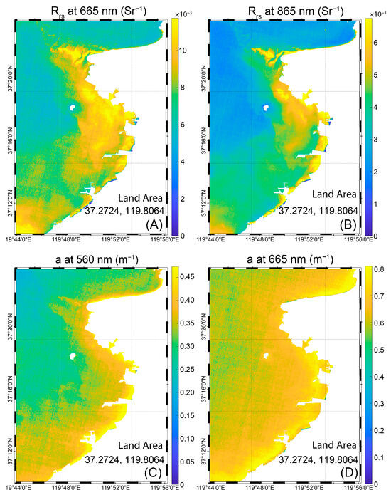Optimal feature combination and corresponding Rrs and IOPs results near Laizhou Bay. (A) Rrs result at 665 nm. (B) Rrs result at 865 nm. (C) QAA result of a at 560 nm. (D) QAA result of a at 665 nm.