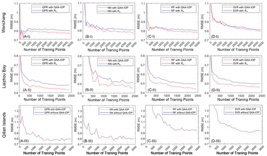 By matching the ICESat-2 bathymetry points with Sentinel-2 imagery, 5312 data pairs are obtained near Wenchang, 2451 pairs near Laizhou Bay, and 3612 pairs near the Qilian Islands. Figure 7 shows how the RMSE of each bathymetry model changes as the number of data training pairs increases. As indicated by the trends in Figure 7, with the exception of the Qilian Islands area, the dataset incorporating QAA-IOP considerably outperforms the dataset with only Rrs, which suggests that the application of QAA-IOP can enhance predictive accuracy and performance, especially in worse water quality or less transparency. Near Wenchang, as the number of training pairs increases to 1000, the GPR and NN algorithms training on the QAA-IOP dataset gradually perform better than that on the Rrs dataset. Notably, the GPR algorithm performs well even with only 1000 training pairs, indicating it may perform better under less data conditions. Near Laizhou Bay, when training pairs reach 500, the accuracy of all four QAA-IOP datasets begin to consistently surpass the four Rrs models. As illustrated in Figure 7C-III,D-III, near the Qilian Islands, the convergence rates of RF and SVR are significantly lower than the other two areas.
