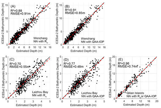 Bathymetry validations for Wenchang and Laizhou Bay using the NN algorithm. The black solid line represents the 1:1 reference line and the red dashed line represents the regression line. (A) Scatterplot with the Rrs dataset in Wenchang; (B) scatterplot with the QAA-IOP dataset in Wenchang; (C) scatterplot with the Rrs dataset in Laizhou Bay; and (D) scatterplot with the QAA-IOP dataset in Laizhou Bay; and (E) scatterplot with the Rrs or QAA-IOP dataset in the Qilian Islands. Note that the performance of the QAA-IOP dataset is identical to the Rrs dataset in the Qilian Islands.