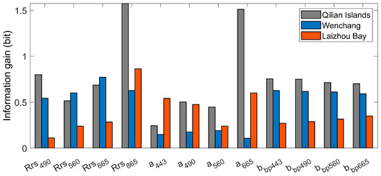 As shown in Figure 10, for the Wenchang region that belongs to the Jerlov III water type, the diffuse attenuation coefficient (Kd) is primarily contributed by scattering from water and dissolved particulate matter [47]. Hence, incorporating the particulate backscattering coefficient, such as bbp(490), can effectively improve the accuracy of SDB. In the case of Laizhou Bay, which belongs to the Jerlov 7C water type, the information gains from Rrs at visible wavelengths become significantly lower compared to IOPs. As a result, during the SDB process, the priority of features should be given to the bands that include the effects of Colored Dissolved Organic Matter (CDOM) and chlorophyll, such as a(490) and a(665). For the Qilian Islands, considering IOPs fail to achieve higher SDB accuracy than the Rrs dataset, which may be due to the very clear waters that contain little particles. For regions across all three water quality types, Rrs(856) provides a very high information gain, which might be that the near-infrared (NIR) band supplies essential information for compensating for residuals in the sun glint correction and atmospheric correction.