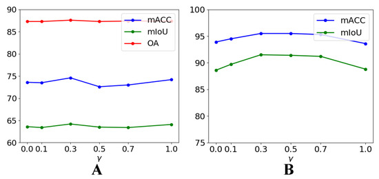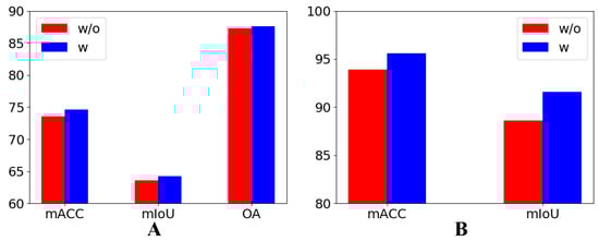 In the feature generative network, the input of the feature generator includes a semantic feature and a standard Gaussian noise, and it outputs a synthesized point feature. It is implemented by a three-layer fully connected neural network (FCNN), whose input unit number and latent unit number are 600 (300-D for semantic features and 300-D for Gaussian noise) and 1024, respectively, in all tasks, and its output unit number depends on the corresponding point feature dimensionality, i.e., for DGCNN/RandLA-Net/SCF-Net, respectively. The input of the feature discriminator contains a semantic feature and a point feature, and it outputs a 0/1 classification result. It is also implemented by a three-layer FCNN, whose output unit number and latent unit number are 1 and 1024, respectively, and its input unit number is equal to the sum of the corresponding point feature dimensionality and the semantic feature dimensionality, i.e., for DGCNN/RandLA-Net/SCF-Net, respectively. The generator and the discriminator are adversarially trained for 20 epochs, with a batch size of 32, a learning rate of , and an Adam optimizer. After training the generative network, the generator is used to synthesize any large number of point features of a specified class with its semantic feature and standard Gaussian sampling, which are then used for semantics-enhanced classifier training.