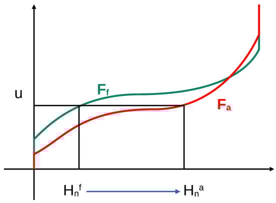 Typically, neither nor are known a priori, so they need to be estimated from the ensemble and, in the case of , from the observation value. Please note that is the quantile function for the posterior distribution and that the ensemble members retain their quantiles when moving from the forecast to the analysis. Ensemble filters that operate in this way have, therefore, recently been called ‘Quantile-Conserving Ensemble Filters’ (QCEFs [5]). The action of a QCEF on a single ensemble member is illustrated in Figure 1. Figure 1 illustrates a QCEF where the prior and posterior CDFs have jump discontinuities; the appropriate definitions of these functions and their inverses in such a case are discussed in Appendix A.
