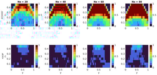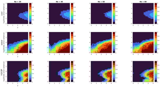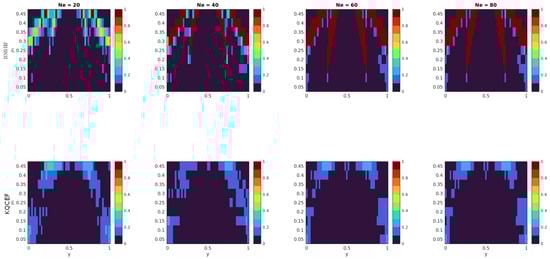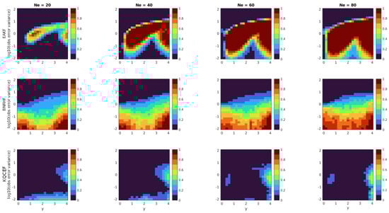 Each panel in Figure 3 shows the fraction of times that the KS test rejected the null hypothesis at the 5% significance level. The horizontal axis shows the value of y, while the vertical axis shows the logarithm of the observation error variance. Low values indicate that the analysis ensemble produced by the ensemble filter was frequently consistent with the true posterior distribution. The top row shows the EAKF results, the middle row shows the BNRHF results, and the bottom row shows the KQCEF results. The columns show the results for , and 80, from left to right.