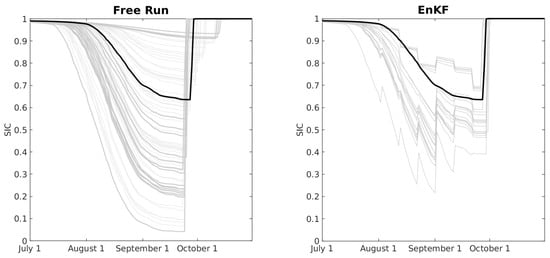 This behavior is common across the time window of interest. The smallest analysis ensemble member produced by the EAKF is almost always significantly smaller than the smallest analysis ensemble members produced by BNRHF and KQCEF across the time window of interest, which is indicative of a longer tail towards low SIC values in the EAKF analysis. This can be traced back to the way in which the filters update the ensemble. The EAKF shifts and scales the ensemble but does not otherwise change its shape. Thus, if the atmospheric forcing and perturbed parameters conspire to create a forecast with a long tail towards small SIC values, the EAKF analysis will also have a tail towards small SIC values. In contrast, both BNRHF and KQCEF change the shape of the ensemble, e.g., moving from a bimodal forecast to a unimodal analysis as shown in the right panel of Figure 11. In this specific context of the Icepack model with perturbed parameters, the result is a poorer performance of EAKF.