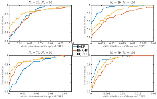 The BNRHF performs well on this problem only when the observation error variance is large, in which case all the methods perform well. When the observation error variance is small, the BNRHF performs worse than the EAKF. In this case, the problem exhibits what some authors have called ‘medium nonlinearity’ [20,21]: The prior is very non-Gaussian, but the posterior is approximately Gaussian. In such cases, the EAKF effectively ignores the prior and moves all the ensemble members closer to the observed value y. The BNRHF uses an approximation of the likelihood function and posterior PDF that is piecewise-linear between the ensemble members. If the likelihood is so tight that the structure of its peak falls between ensemble members, then the BNRHF cannot correctly represent the posterior PDF, which leads to errors. See Section 5.1 for further discussion of this issue.