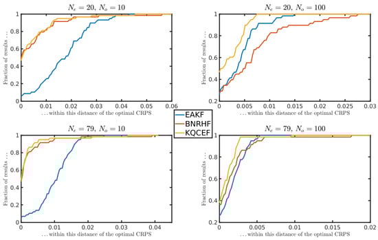 It is seldom the case in practice that the forecast comes from a known family of parametric distributions and that the likelihood is conjugate to the prior. But in those cases, or in cases where the forecast distribution is well-approximated by a parametric distribution that is conjugate to the likelihood, one expects that a filter based on conjugate parametric distributions (cf. the methods discussed in [5,19]) will outperform nonparametric approaches like the BNRHF and KQCEF. That is indeed the case here: the prior and likelihood are both normal, which precisely matches the assumptions of the EAKF, and we see that the EAKF performs best of the three algorithms in this test. The only source of errors in the EAKF is sampling errors in estimating the prior mean and variance. These sampling errors decrease as the ensemble size increases, but so does the sensitivity of the KS test; combined, these effects lead to minimal changes in the accuracy across ensemble sizes. The EAKF performs well overall but slightly less well when the observation is in the tail of the prior and when the observation error variance is comparable to the prior variance.