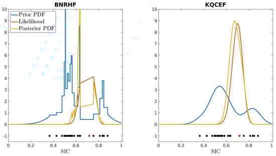 Figure 11 illustrates this using a 20-member ensemble forecast of SIC from the BNRHF filter on 27 September 2011. The BNRHF prior PDF for this ensemble is shown in blue on the left panel, while the KQCEF prior PDF for this same ensemble is shown in blue on the right panel. In both panels, the 20 ensemble members are shown as black dots below the PDFs, and the reference value of SIC is shown as a red dot. The forecast distribution is bimodal, and the reference value lies between the two modes where there are few ensemble members. The red line in the right panel corresponds to the likelihood for and . The KQCEF obtains its posterior PDF by multiplying its prior PDF by the likelihood function (yellow line, right panel). The red line in the left panel evaluates the likelihood of the ensemble members and linearly interpolates between these values. The BNRHF obtains its posterior PDF by multiplying its prior PDF by this linearly interpolated approximation of the likelihood (yellow line, left panel). In this example the reference value (and the peak of the likelihood) is in a trough between two modes of the prior, where there are few ensemble members. Because the BNRHF only evaluates the likelihood at the ensemble members, the peak of the likelihood is not correctly represented, and the BNRHF posterior is incorrect: in this example, the BNRHF posterior PDF is bimodal, with peaks on either side of the reference value. With a larger ensemble, there are fewer gaps, the BNRHF’s piecewise-linear approximation of the likelihood is more accurate, and the result is more accurate.