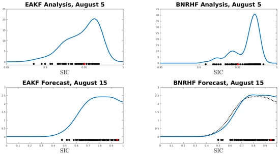 The top row of Figure 12 shows the analysis ensemble (black dots) produced by EAKF (left) and by BNRHF (right) on 5 August 2011; the blue line in each panel is a kernel-density estimate of the analysis PDF, and the red dot shows the reference SIC value. The BNRHF distribution is more tightly centered than the EAKF distribution and is biased high compared to the true SIC value; as a result, the CRPS associated with the EAKF is better (0.0058) than the CRPS associated with the BNRHF (0.0099). Notice that the EAKF produces an analysis ensemble with a longer tail towards low SIC values than the BNRHF. In particular, the smallest ensemble member in the EAKF analysis is noticeably smaller than the smallest ensemble member in the BNRHF analysis.