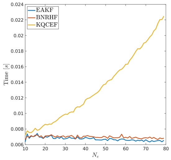 The computational cost of these filters is negligible compared to the forecast step, even when the forecast is an extremely low-cost single-column ice model. On a simple workstation, the forecast step with 79 ensemble members took approximately 8 s. The typical time required to run a single assimilation cycle was computed using the free-running forecast from Figure 8 on 27 September 2011 as the forecast ensemble. The ensemble size was varied from 10 to 79 by selecting the first members of the free-running ensemble. The likelihood used and varied k from 20 through 80. The median time to perform the assimilation was computed across these values of k, and the results are shown as a function of ensemble size in Figure 13. Both EAKF and BNRHF have a total cost approximately independent of ensemble size at a value near 0.007 s per assimilation cycle. The code is not parallelized, so the independence with respect to ensemble size means that the total cost is dominated by overhead costs. KQCEF has a total cost that scales approximately linearly with , which is comparable to the cost of EAKF and BNRHF at and more than three times more expensive at . Even at though, the total cost of the filter is negligible compared to the cost of the ensemble forecast.