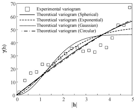 Figure 3 presents the experimental and theoretical variograms. The black square marks indicate the experimental variogram for the variogram cloud explained in Figure 2. When compared with the variogram cloud, the experimental variogram more clearly explains the spatial correlation of the data set, as shown in Figure 3. However, since the experimental variogram has discontinuous values, theoretical variograms with continuous values should be obtained. To construct a theoretical variogram, various covariance functions, such as the spherical model (solid line), exponential model (dashed line), Gaussian model (dotted line), and circular model (dash-dotted line), can be applied to the experimental variogram, as shown in Figure 3 [18]. Subsequently, the obtained theoretical variogram is used to calculate the weights of all the sample points [18].