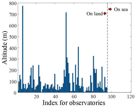 Figure 5 presents all the altitudes of the meteorological observatories in Korea. As can be seen in Figure 5, most of the meteorological observatories are located below 150 m in altitude, but some base stations are installed at high altitudes of over 700 m. Therefore, the altitudes of the ground stations vary from the lowest altitude of 1.4 m to the highest altitude of 772.4 m, and the altitudes of the 24 stations located on the sea are all assumed to be 0 m. Since meteorological data generally tend to vary depending on the altitude of the observation site, the atmospheric refractivity N is also affected by the altitude. Therefore, in order to eliminate deviations in the refractive index according to the altitude, the atmospheric refractivity N should be normalized to an altitude of 0 m.