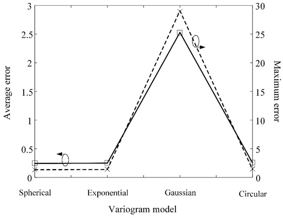 Average and maximum estimation errors of the Kriging interpolation according to the variogram models.