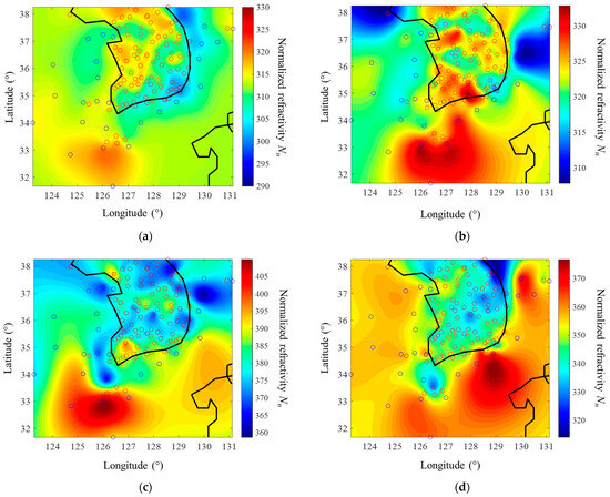 Detecting targets earlier and at longer distances has long been a major aspiration in long-range radar applications, and considerable research has been conducted to achieve this goal [1,2,3,4,5]. These long-range radars can detect targets with a radar cross-section (RCS) from several square meters up to 400 km. However, in the atmosphere close to the Earth’s surface, the refractivity index varies depending on the altitude, which causes the electromagnetic waves radiated from the radar to propagate in a bent path instead of a straight path [6,7,8,9]. Therefore, as the detection distance increases, a larger detection error can be expected due to this change in the atmospheric refractive index. Thus, it is important to estimate the propagation path of the radar signal in the real environment by analyzing the atmospheric refractivity and finding a correction value that can compensate for the detection error. In this regard, the atmospheric refractivity index can be obtained from meteorological data such as the temperature, humidity, and pressure, but such meteorological data can only be measured in limited locations where meteorological observatories exist [10,11,12]. Therefore, the atmospheric refractivity at a location without meteorological observatories must be predicted using the interpolation and extrapolation methods. In the previous research for the interpolation of the atmospheric refractivity, various methods such as a nearest-neighbor, linear interpolation, and inverse distance weighting (IDW) methods were used to predict the refractivity in arbitrary locations [13,14,15]. However, since these studies conducted interpolation only using data obtained from less than 10 stations, the reliability of the interpolation results is not sufficiently verified. In addition, previous studies used the N- or M-units [16] to express atmospheric refractivity, but these values tend to vary depending on the altitude of the observation site.