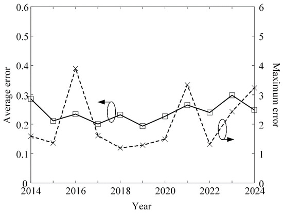 Figure 10 shows the average and maximum estimation errors of the Kriging interpolation on January 1 of each year from 2014 to 2024. The average estimation errors remained in the range of 0.19 to 0.3 over the 11 years, and the maximum estimation errors remained in the range of 1.29 to 3.89 during the same period. This result means that for the same date, the estimation error does not change significantly if the year changes.