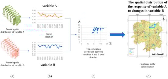 A change curve (Figure 3b) exists for variables A and B (Figure 3a) within N years for any pixel point, which represents the trend of the changes in the variables at that location over N years. A scatter plot of the values of variables A and B in the same year was created (Figure 3c). We then calculated the correlation index r of the two variables as follows [42]: