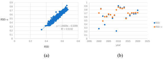 The calculated RSEI-v needs to be normalized again to facilitate subsequent time series and correlation analyses. The formula for this process is provided in Appendix A Formula (A6). We also calculated the RSEI for the study area from 2000 to 2020 using the method used by Xu et al. to examine the performance of RSEI-v by comparing the two methods using random point sampling.