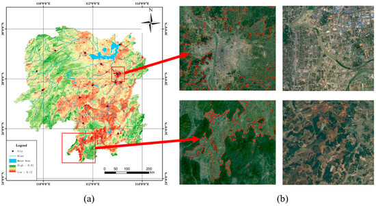(a) Characteristics of the spatial distribution of EEQ; (b) range and high-definition remote sensing images of some typical study areas (Google Earth imaging date: December 2019).