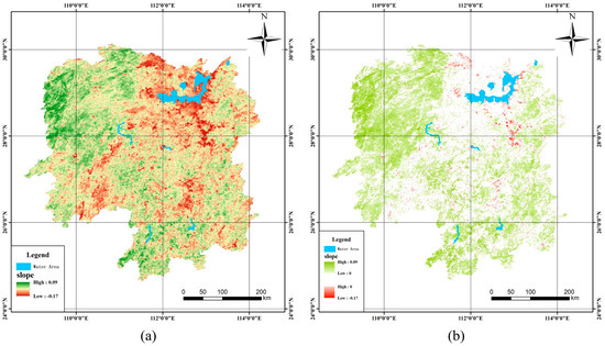 Pattern of the changes in the spatial distribution of EEQ over time: (a) slope index; (b) slope index that passed the Mann–Kendall test.