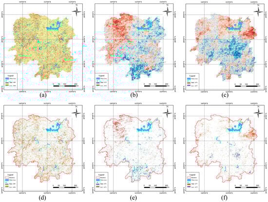 The temperature mainly showed positive correlations with the EEQ (Figure 7c), accounting for 65.14% of the total area. The areas positively correlated with the EEQ were mainly distributed in the northeastern and northwestern mountainous study areas. The areas where temperature negatively correlated with the EEQ were mainly concentrated in the plains around Hengyang, in the middle of the study area. The areas that passed the significance test accounted for 6.18% of the total region (Figure 7f); among these, the areas where temperature negatively and positively correlated with the EEQ accounted for 16.82% and 83.18% of the total, respectively. The areas where temperature significantly positively correlated with the EEQ were mainly distributed in the northeastern mountainous study area, and the land cover type was mainly forest land. Areas that were significantly negatively correlated with the EEQ were mainly distributed in the cultivated land in the middle of the study area.