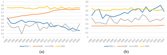 We used 100 random sampling points to conduct tests for EEQD and EEQI areas. The data obtained at each sampling point were synthesized into the mean and plotted as a line graph in chronological order (Figure 8). In Figure 8a, the RSEI-v strongly decreases for EEQD areas (R2 = 0.7962), HUM continuously and stably increases (R2 = 0.963), TEM slowly decreases, and PER does not notably change. In Figure 8b, for EEQI areas, the RSEI-v slowly increases (R2 = 0.3974); PER fluctuates with an upward trend, and the other two independent variables do not considerably change. A comparison of Figure 8a,b shows that the TEM and HUM values for EEQD areas are substantially higher than those of EEQI areas; the PER of the two types of areas are similar. The trend of the change in each variable for EEQD areas is stronger than that for EEQI areas. The changes in each variable show that human activities and temperature changes lead to a continuous decline in EEQ in EEQD areas. In EEQI areas, changes in precipitation more strongly impacted the EEQ. Human activities caused a continuous decline in EEQ that was larger than the increase in EEQ caused by changes in climate. The sampling conclusions are similar to those in Table 3.