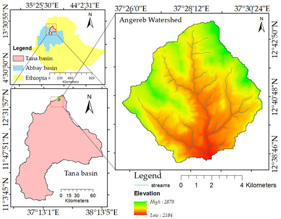 The research area watershed, named the Megech watershed, is located at 11°45′40″ and 12°44′57″N latitude and 37°24′2″ and 37°37′21″E longitude in the Upper Blue Nile Basin of the tributary of Lake Tana, the largest lake in Ethiopia (Figure 1). The Megech watershed covers 424 km2 at the dam site, with a mean annual flow of 5.6 m³/s. The watershed is characterized as a mountainous, wedge-shaped, and steeply sloping watershed. The study site has two distinctive seasons: a rainy season from May to October and a dry season that extends from November to April. The monthly rainfall varies from 67 mm in October to 306 mm in July, and the mean annual precipitation is approximately 1100 mm. The mean monthly minimum and maximum temperatures are approximately 14.16 °C and 27.63 °C, respectively. The Angereb watershed at the gauge site is located at 37°28′5″ to 37°32′56″E longitude and 12°38′26″ to 12°43′31″N latitude (WGS_1984 Lat/Long). The watershed area at the gauge site covers 49.74 km2.