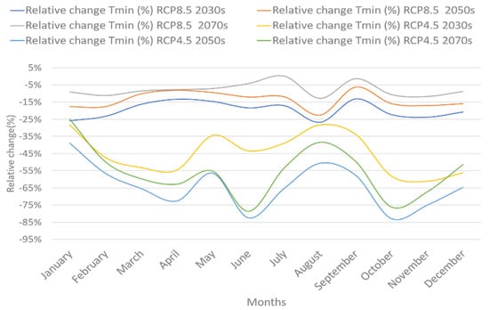 The relative changes in the minimum temperature showed that forecasted monthly values decreased for the 2030s, 2050s, and 2070s compared to the base period for all RCP4.5 and RCP8.5 climate scenarios (Figure 5).