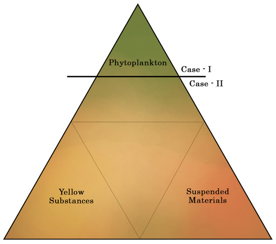 Monitoring coastal water quality presents significant challenges due to the dynamic nature of coastal water bodies influenced by factors such as wind, waves, currents and tides, which can change over short time scales, e.g., hours. Water quality, in this context, refers to the optical properties of water, determined by the concentration of suspended and dissolved organic and inorganic materials. Properties of organic and inorganic materials can be measured through remote sensing techniques, estimating parameters such as phytoplankton concentration, total suspended solids (TSS) and yellow substances including coloured dissolved organic matter (CDOM) [1,2,3,4,5,6]. Globally, in remote sensing applications water bodies are classified into two categories: Case I and Case II waters [7]. Case I waters are characterised by suspended organic material originating from phytoplankton biomass, and primarily occurring in open oceans and some coastal waters. As the concentration of chlorophyll increases, these waters show a prominent absorption peak at approximately 440 nm and a shift in the reflectance peak from the blue region (in clear waters) towards the green region at around 570 nm, due to increased pigment concentration [8]. On the other hand, Case II waters encompass types of water bodies dominated by high concentrations of inorganic particles and CDOM, typically found in terrestrial and estuarine water bodies, lakes, streams and rivers (Figure 1). Coastal and estuarine water bodies, which are the focus of this work, have a highly spatially and temporally dynamic mix of Case I and II waters. Remote sensing observations are influenced by the combination of these components, as suspended and dissolved materials absorb, scatter and transmit sunlight differently. The impacts of these on absorption and scattering processes are able to be measured from optical remote sensing (Figure 1), where coastal water bodies will primarily occupy the space in the lower portion of the ternary diagram.