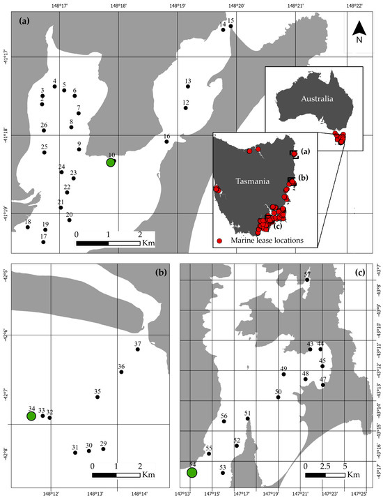 Survey locations of Tasmanian east coast. From north to south: (a) St.Helens, (b) Great Oyster Bay and (c) Bruny Island, Great Bay. Each numbered dot represents a location visited in September 2022, where field sampling was conducted to measure surface chlorophyll. The highlighted sites in green, labelled 10, 34 and 54, are presented in a detailed time-series analysis in Figure 8. The source of aquaculture site locations in Tasmania is provided by [60].