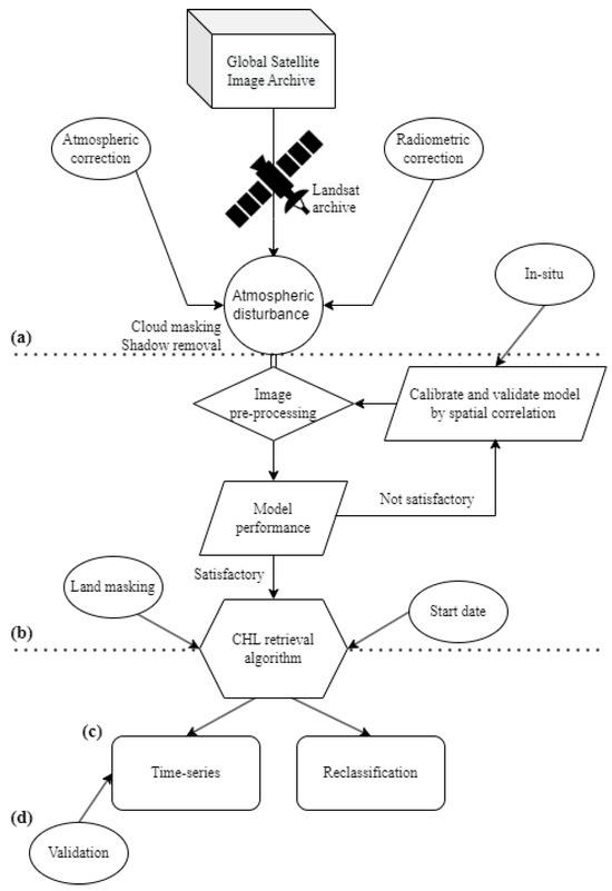 Outline of processing steps used to (a) extract data from satellite images at field study sites to link with in situ data; (b) develop models to estimate Chlorophyll a concentration from satellite reflectance and field measurements; (c) produce time-series of output Chlorophyll a map at each study site; and (d) validate estimated Chlorophyll levels against field data not used in model development.