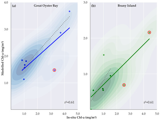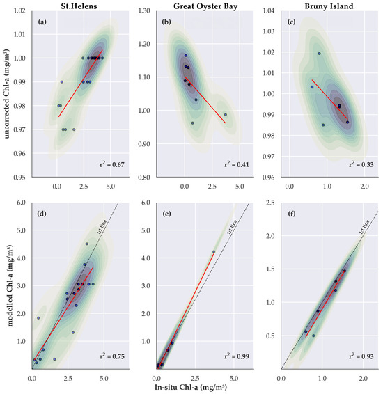 The model parameters were derived using the Blue-Green ratio and plotted against the field samples collected at surveyed locations, which encompass a range of bottom depths, from shallow waters to depths exceeding 20 m (Table 3). Findings obtained from Landsat 8 were compared against the in situ measurements, considering sites across varying benthic depths. Areas with a bottom depth shallower than 2 m were excluded to minimise potential spectral interference from benthic properties. Initial analysis revealed a correlation between modelled and observed chlorophyll data. Table 3 shows the base and derived correlations using the fourth-order polynomial equation, where the parameters of Equation (3) are derived from an automated process. The combined dataset for all regions exhibited a weaker correlation compared to the factors specific to individual sites. However, the site-specific model showed a stronger correlation between modelled and in situ data. Particularly, GOB (b) and BNI (c) sites displayed very strong correlations of 0.99 and 0.93, respectively, with RMSE of 0.22 and 0.14 between the samples. STH (a) site also exhibited a strong correlation of 0.75 (RMSE = 0.74 mg/m3) between satellite-derived and in situ datasets, as shown in Figure 5. The red line on the scatter plot represents a linear least squares fit, illustrating the overall relationship between the variables. The background contour plots show data point density, visualising the distribution and indicating areas with higher frequencies of occurrence. The denser the contours, the more data points are clustered in that region, highlighting the overall trend and variability within the dataset. It is important to highlight that St. Helens site (STH) is surrounded by land on almost all sides and has a complex water column around the bay, due to effects of surrounding topography and terrestrial inputs. This results in more variable water quality compared to open coastal waters.