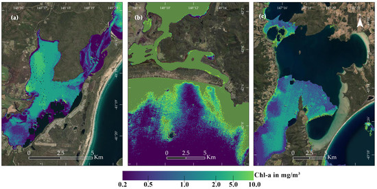 Site-specific model parameters were applied to map chlorophyll a concentration across all three study sites through the automated model. This process allowed for a detailed spatial representation of chlorophyll a distribution, providing insights into the variations and trends across the surveyed areas shown in Figure 6. The incorporation of site-specific parameters ensured the accuracy and relevance of the generated chlorophyll a concentration map, enhancing the applicability of the model to capture the specific characteristics of each site. This semi-automated mapping approach may contribute to a more efficient and standardised assessment of chlorophyll a levels. This approach allows water quality dynamics in the surveyed regions to be estimated from easily accessible, higher spatial resolution satellite data suited to these coastal embayments. In most inshore aquaculture sites, the Chl-a concentration ranges between 0.2 and 2.0 mg/m3. Open water areas generally exhibit a concentration of around 0.2 mg/m3. The concentration increases near the river mouths and close to the land masses due to multiple terrestrial inputs such as sediments, nutrients and other chemicals.